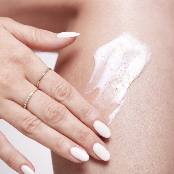 The scrub contains exfoliating particles that gently buff away dry and rough skin. At the same time, the shea butter deeply nourishes and moisturizes, leaving your skin feeling soft and silky.